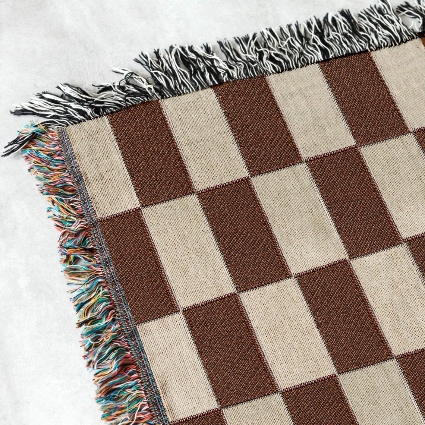 Abstract geometric elongate chequers quilt. Terracotta brown and beige color.