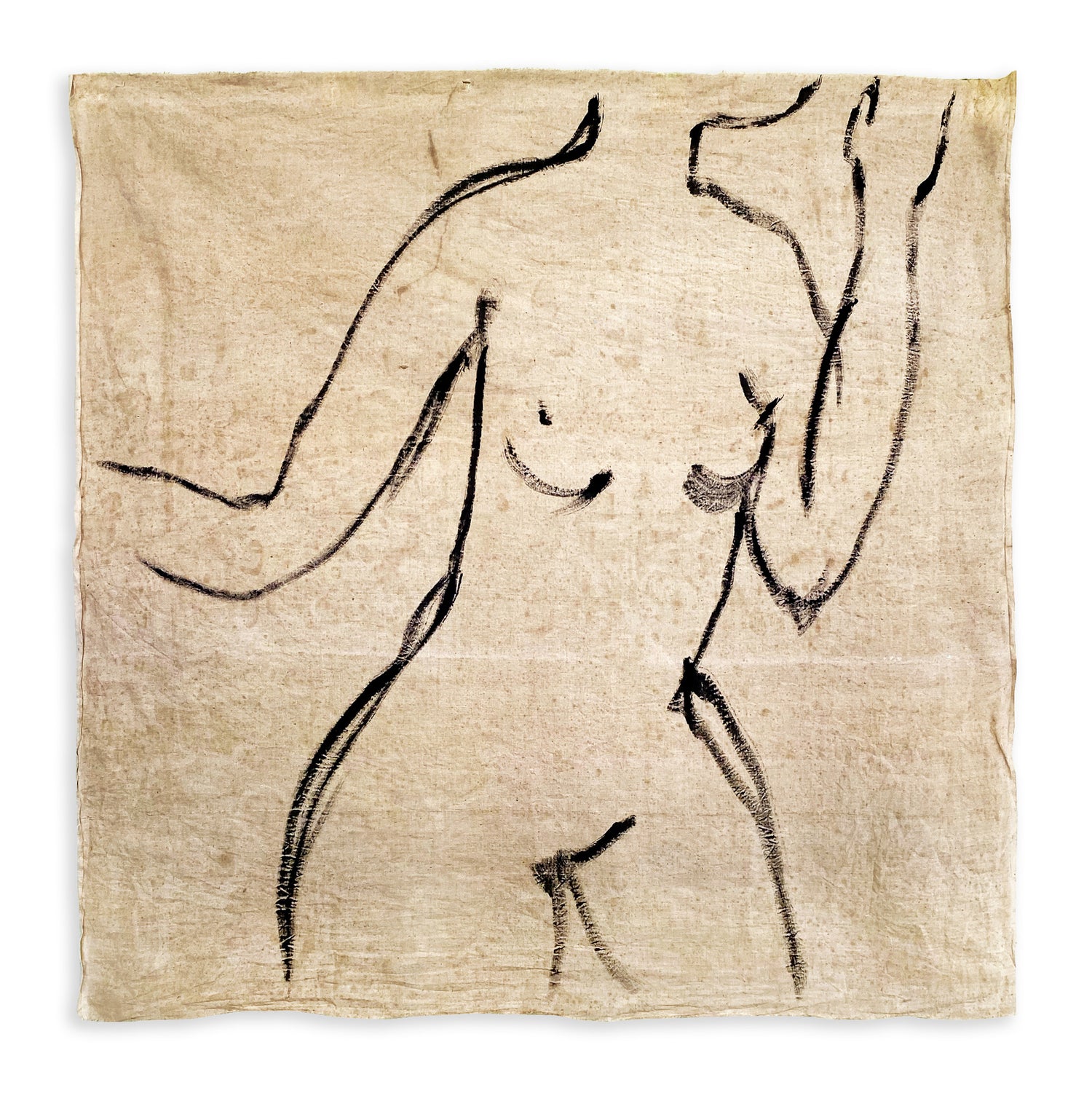 This piece features woman figure painting against a warm beige background, created on a 40-year-old piece of cotton fabric with a naturally stained and aged surface. The minimalistic lines are enhanced by the unique texture of the aged fabric, and I have made the deliberate choice to preserve the naturally aged margins, adding to the piece's character.