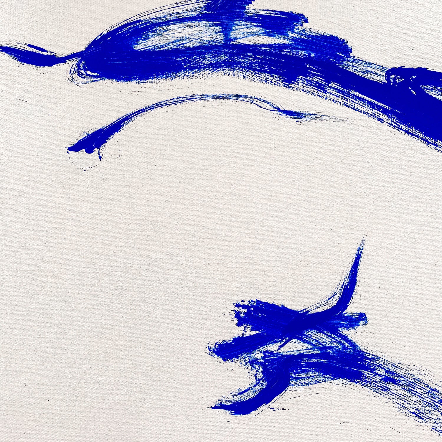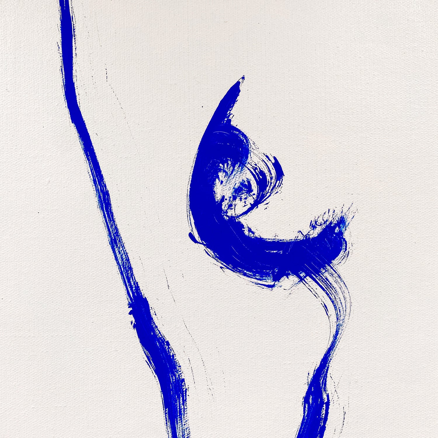 Elegant abstract female body painting. Vivid blue paint on off-white background.