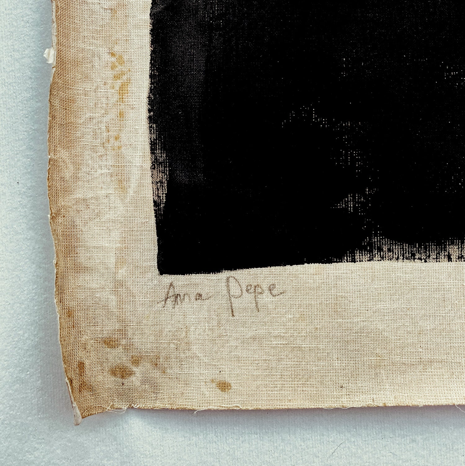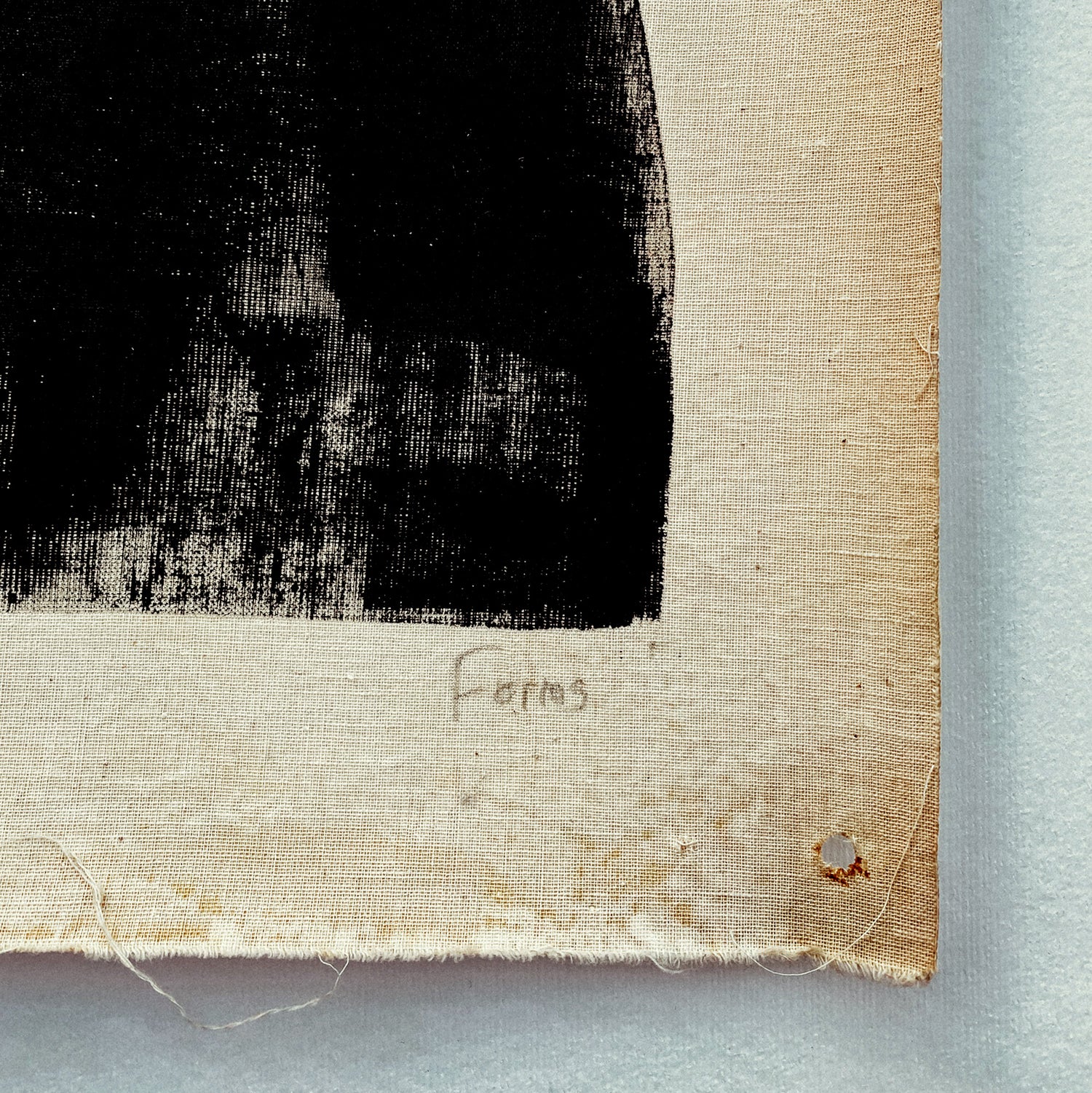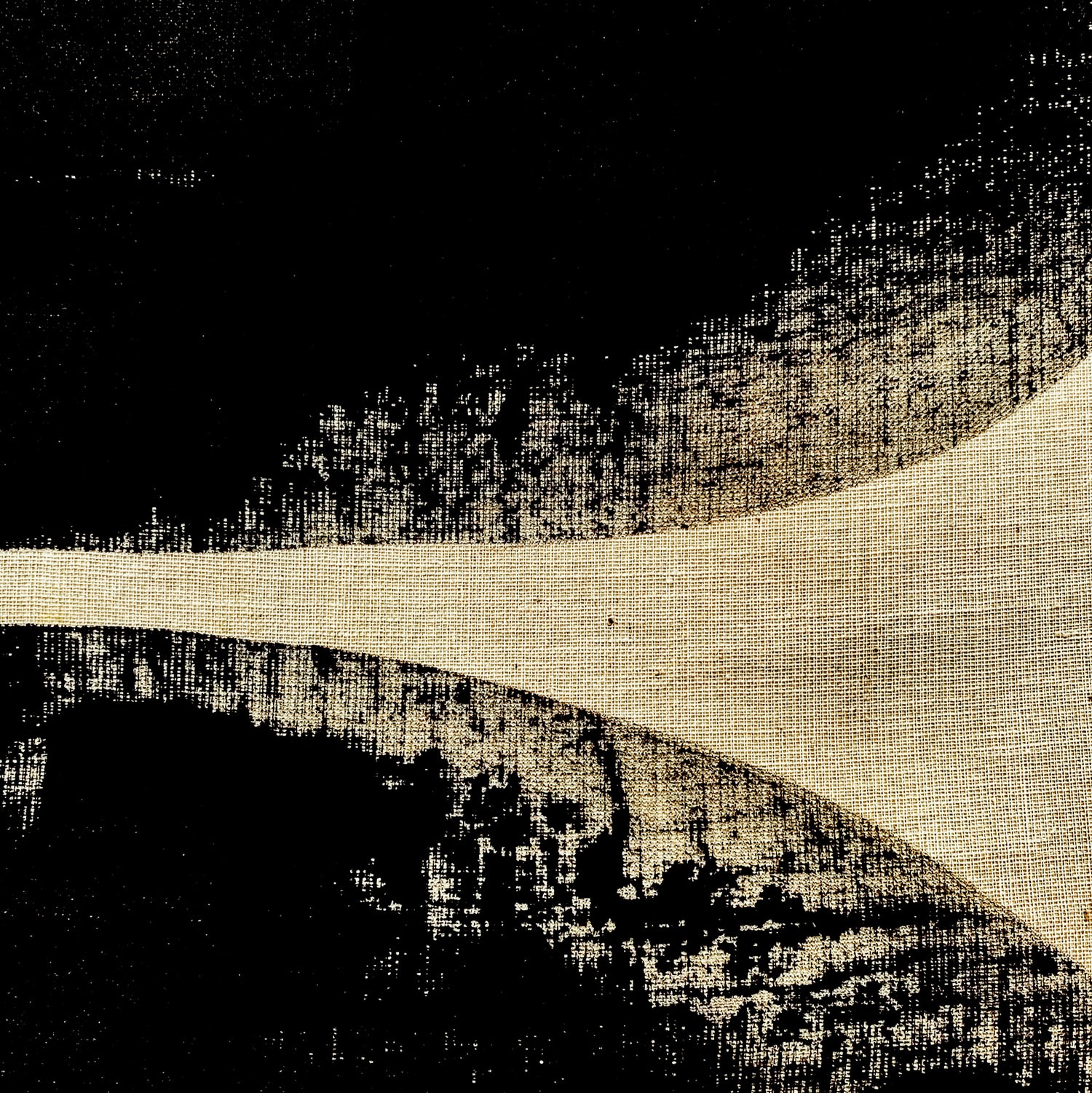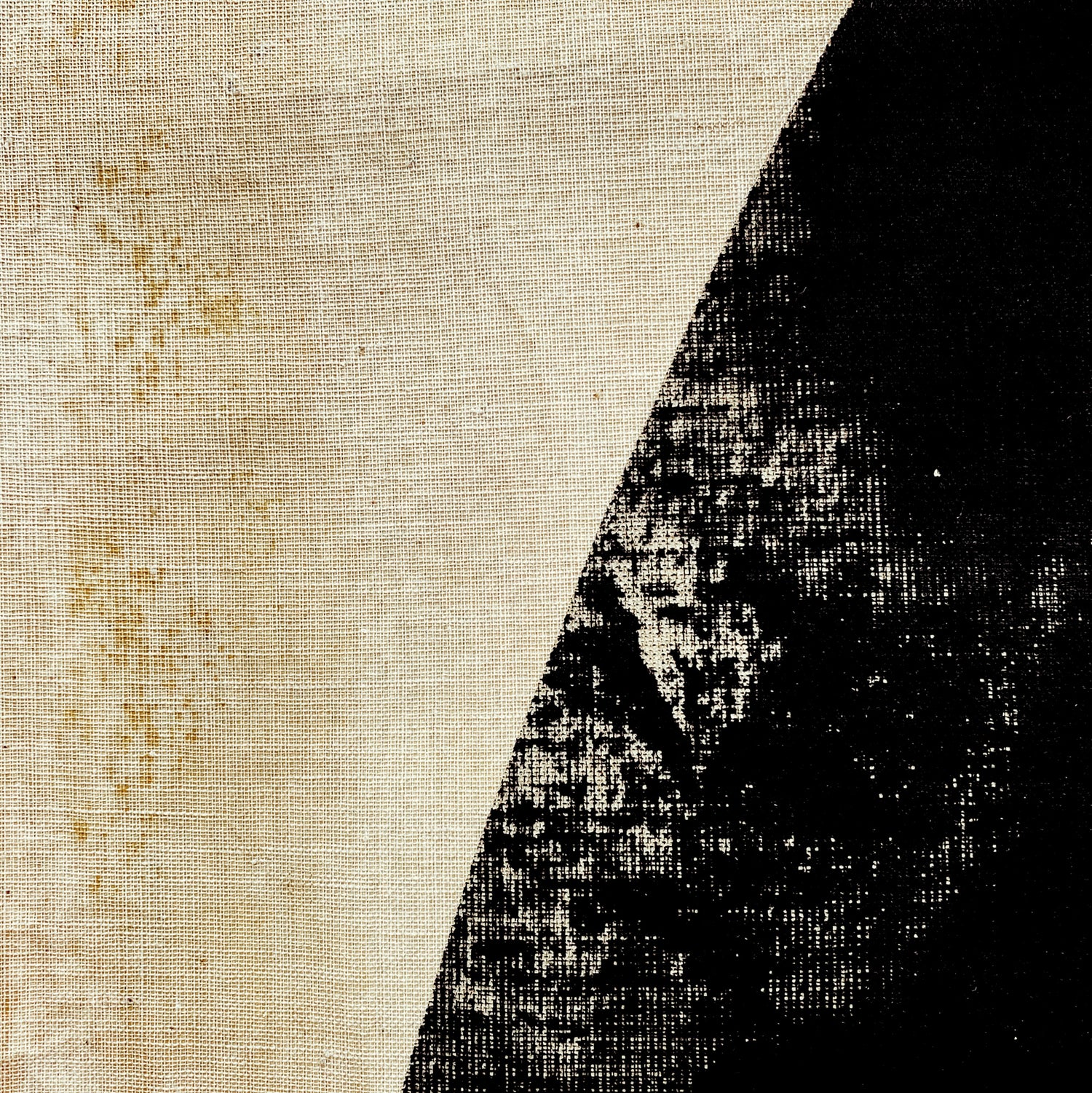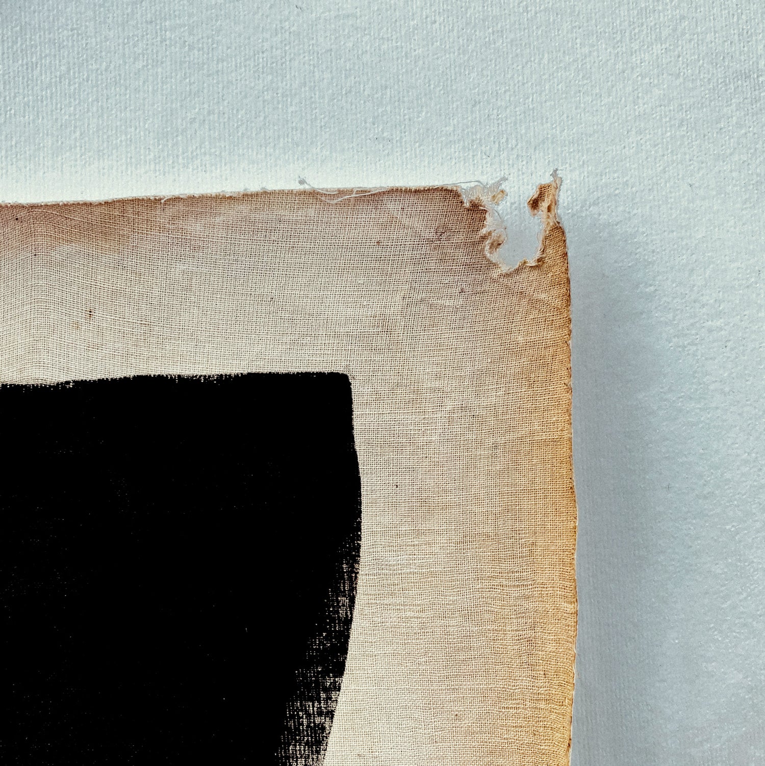 This abstract piece features black forms set against a warm beige background, created on a 70-year-old piece of cotton fabric with a naturally stained and aged surface. The fabric is glued to paper backing.