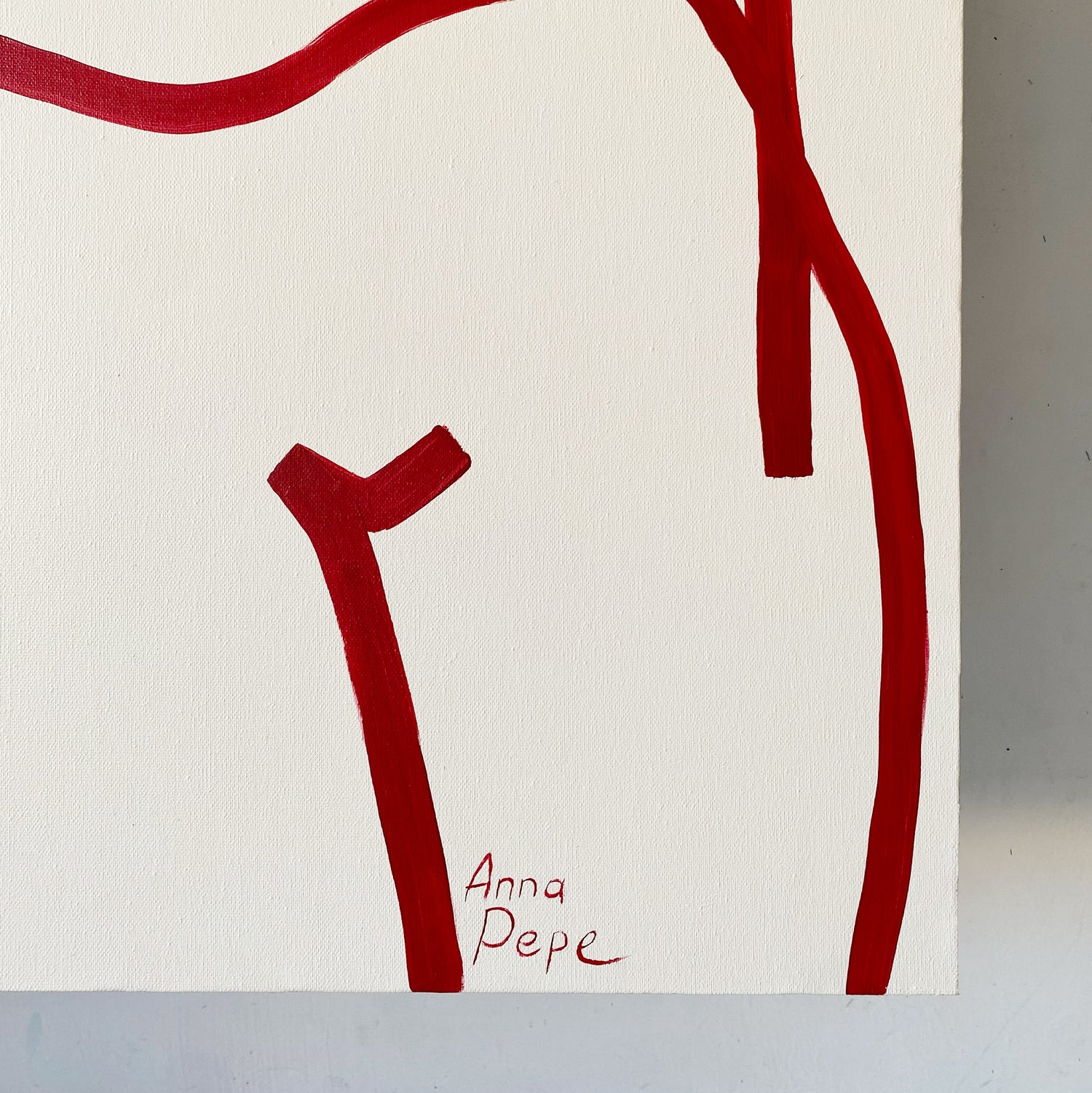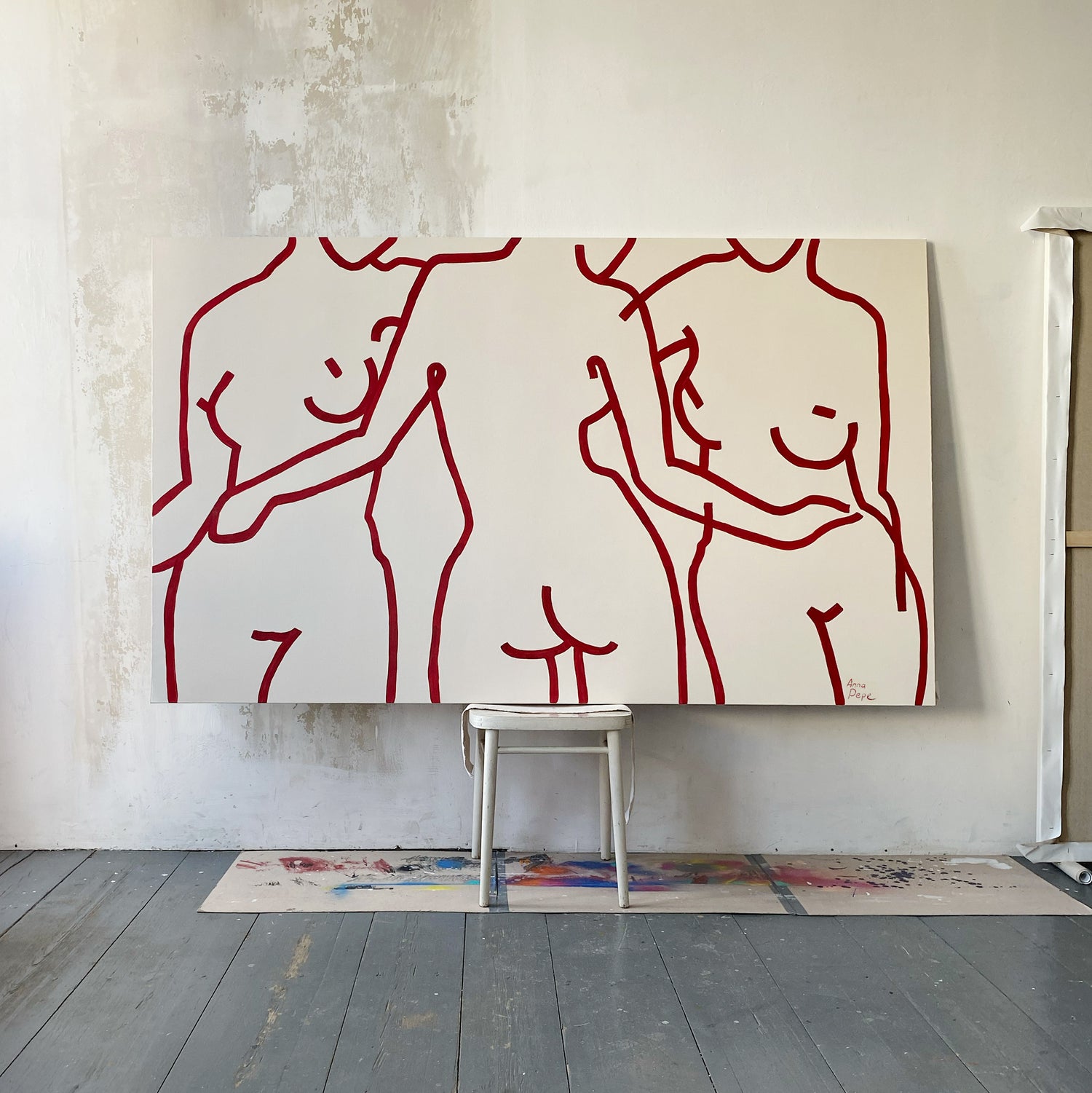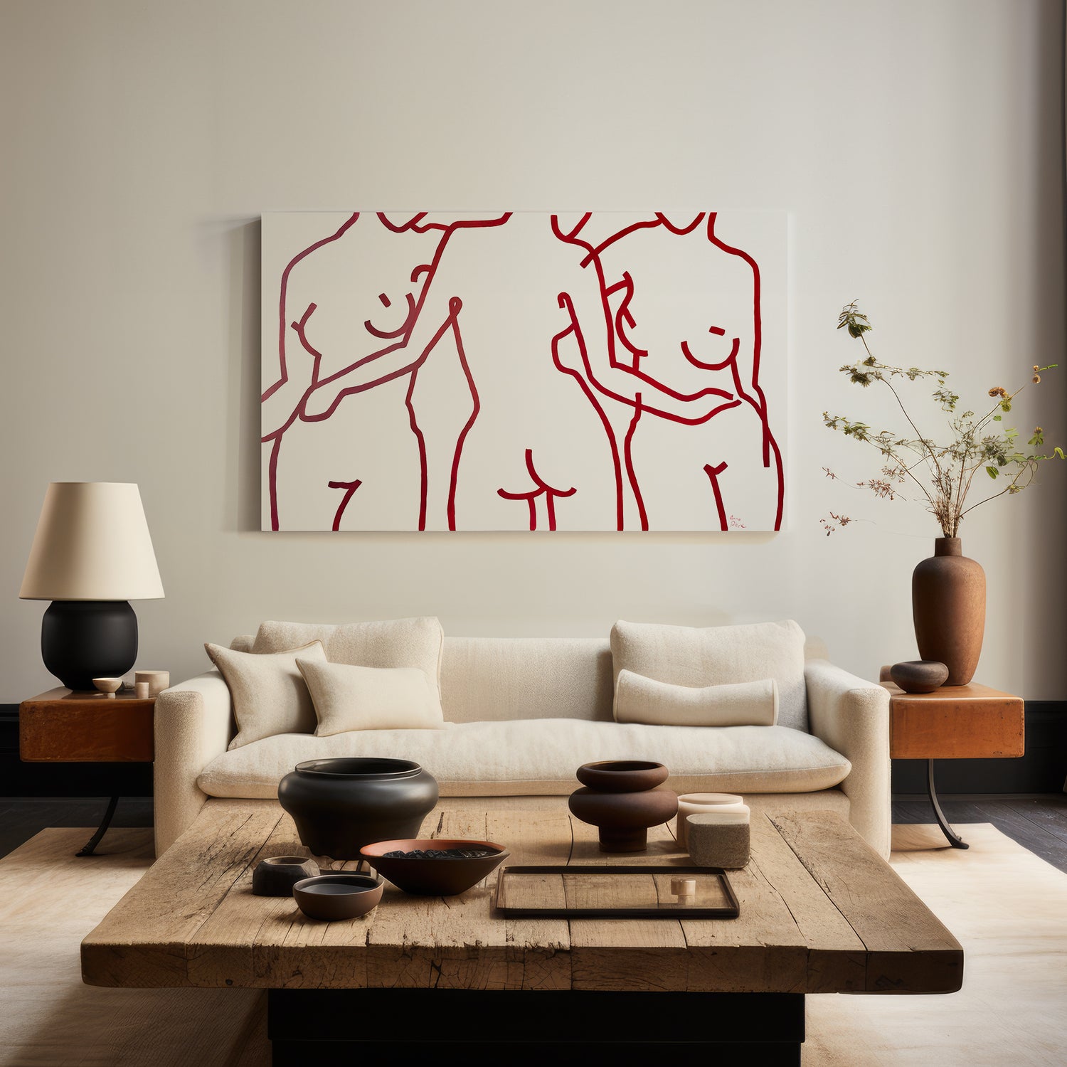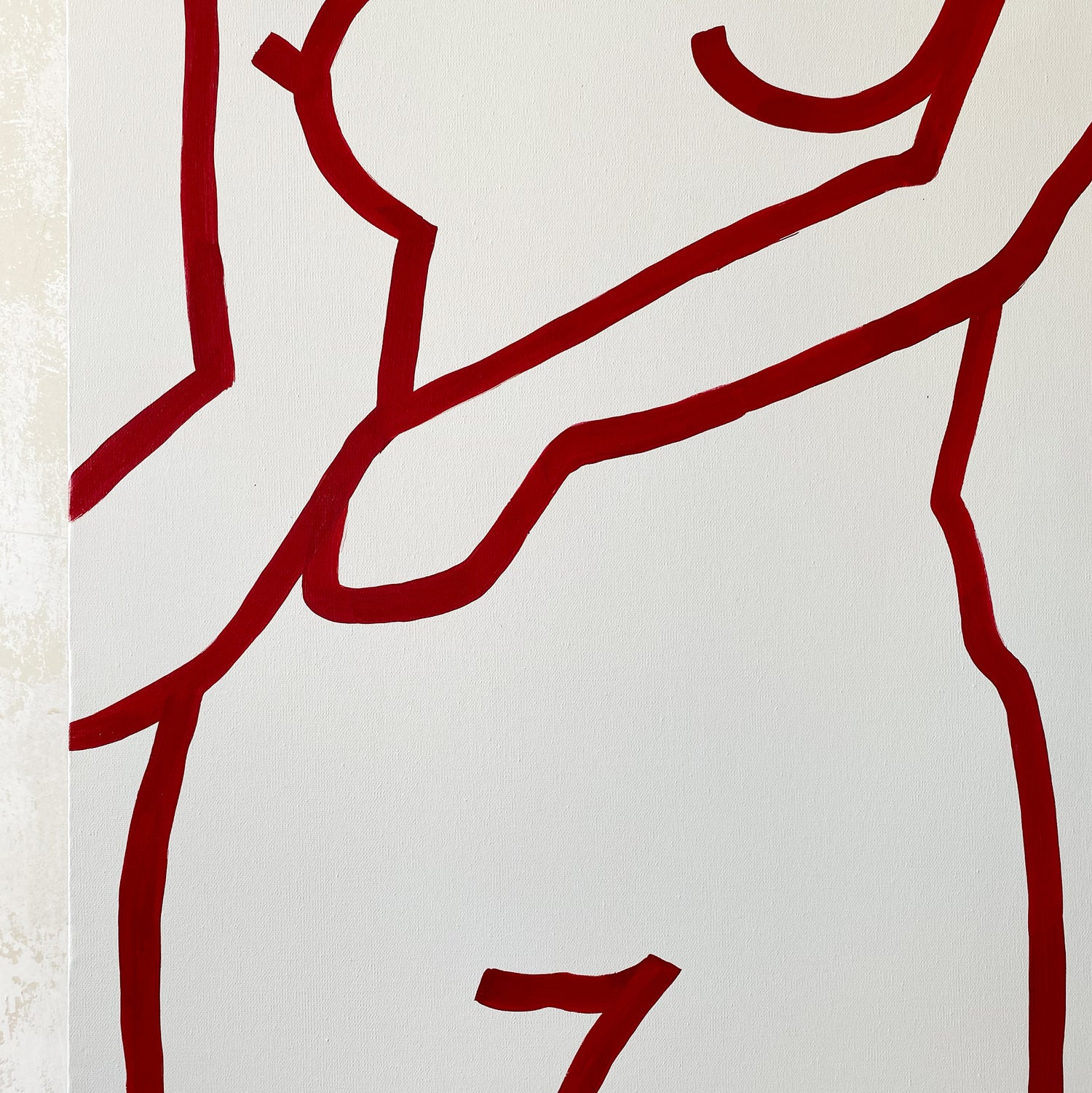 Elegant dancing female bodies. Cherry red on light beige background. Large oversized canvas.