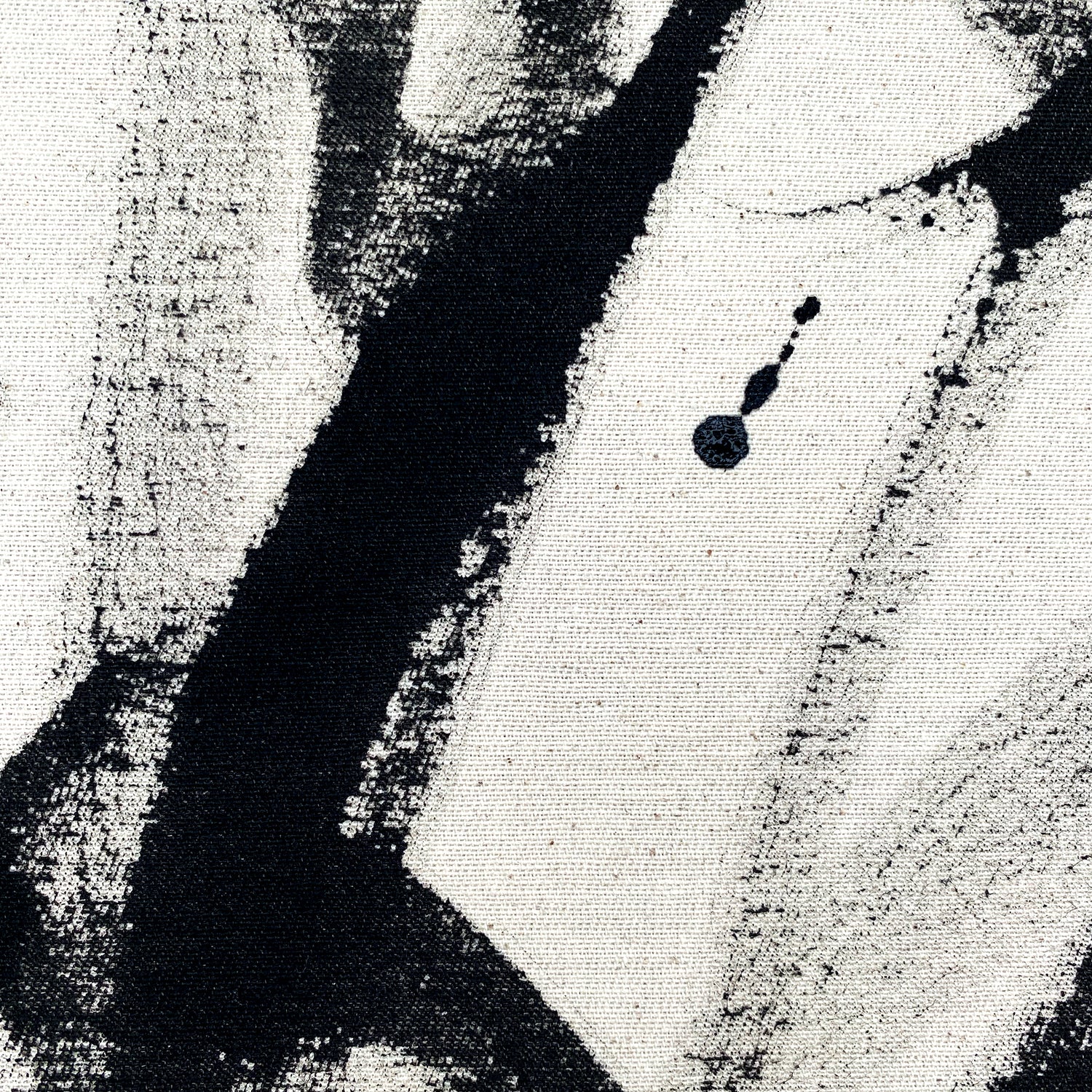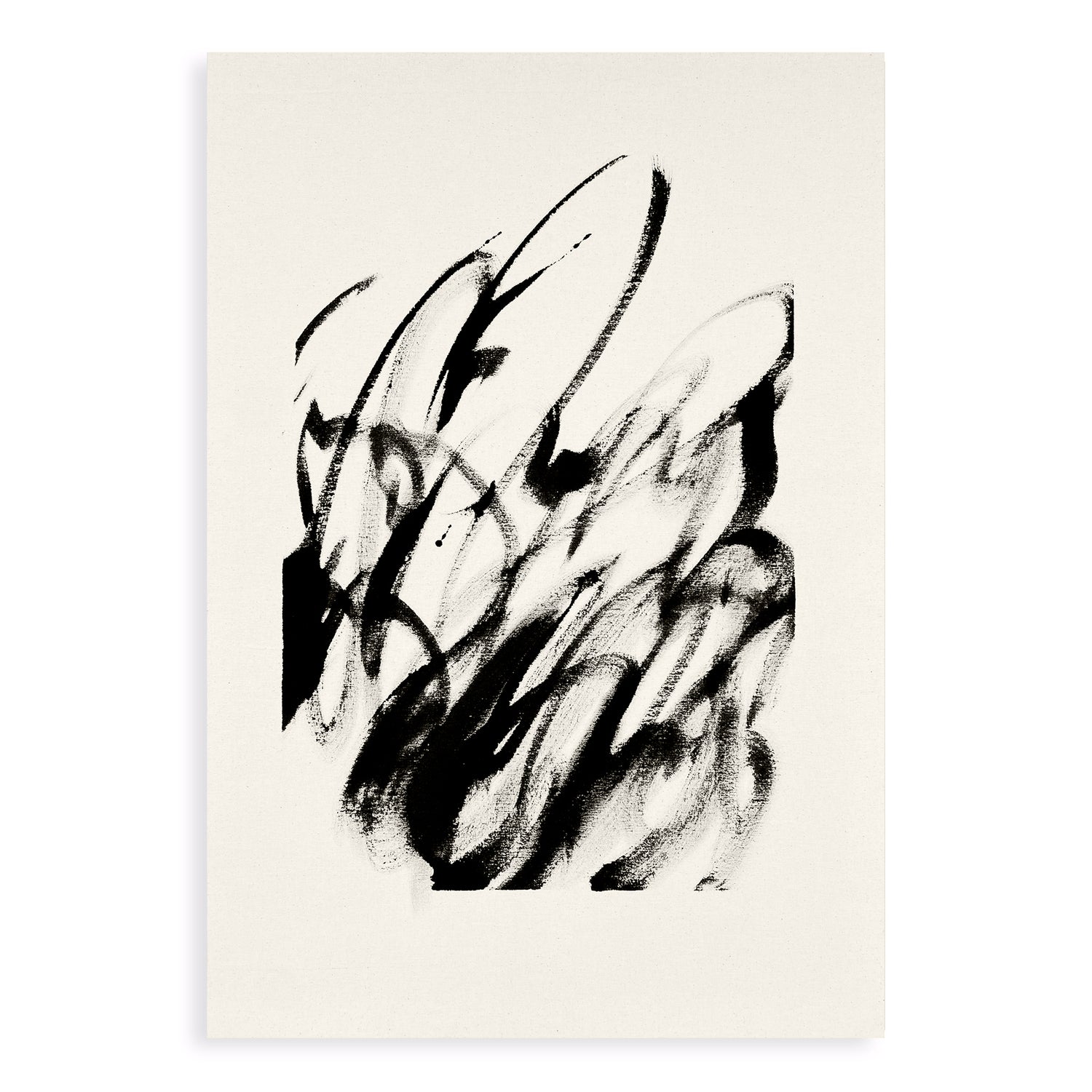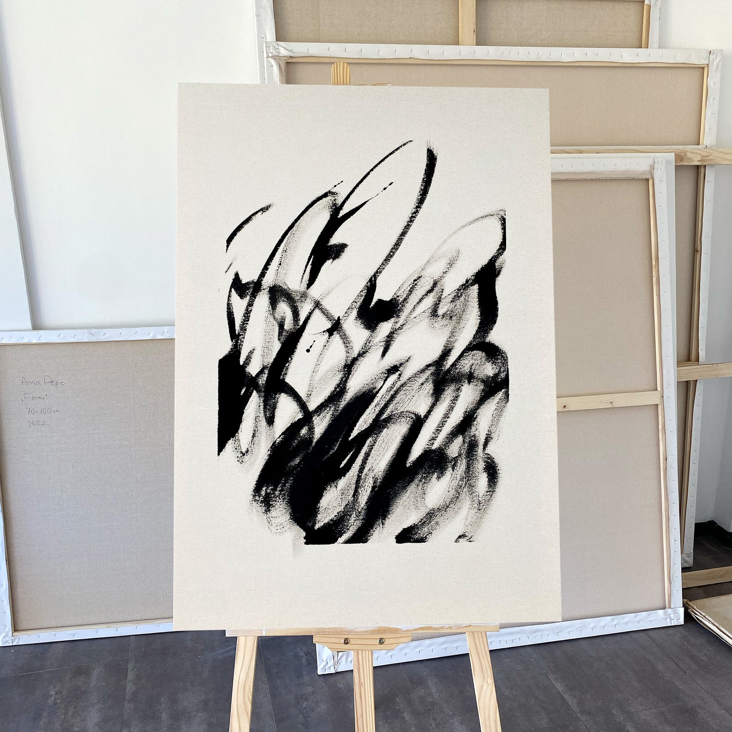 Abstract lines painting. Black paint on warm beige unprimed canvas. Medium format canvas.