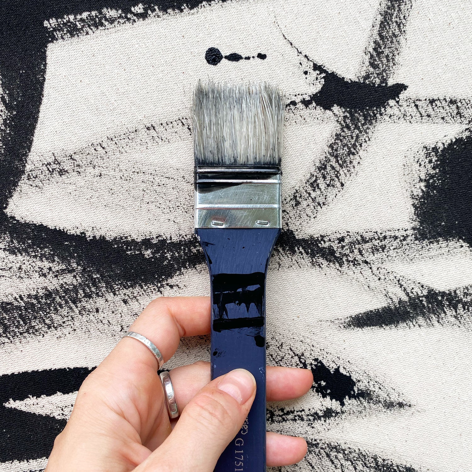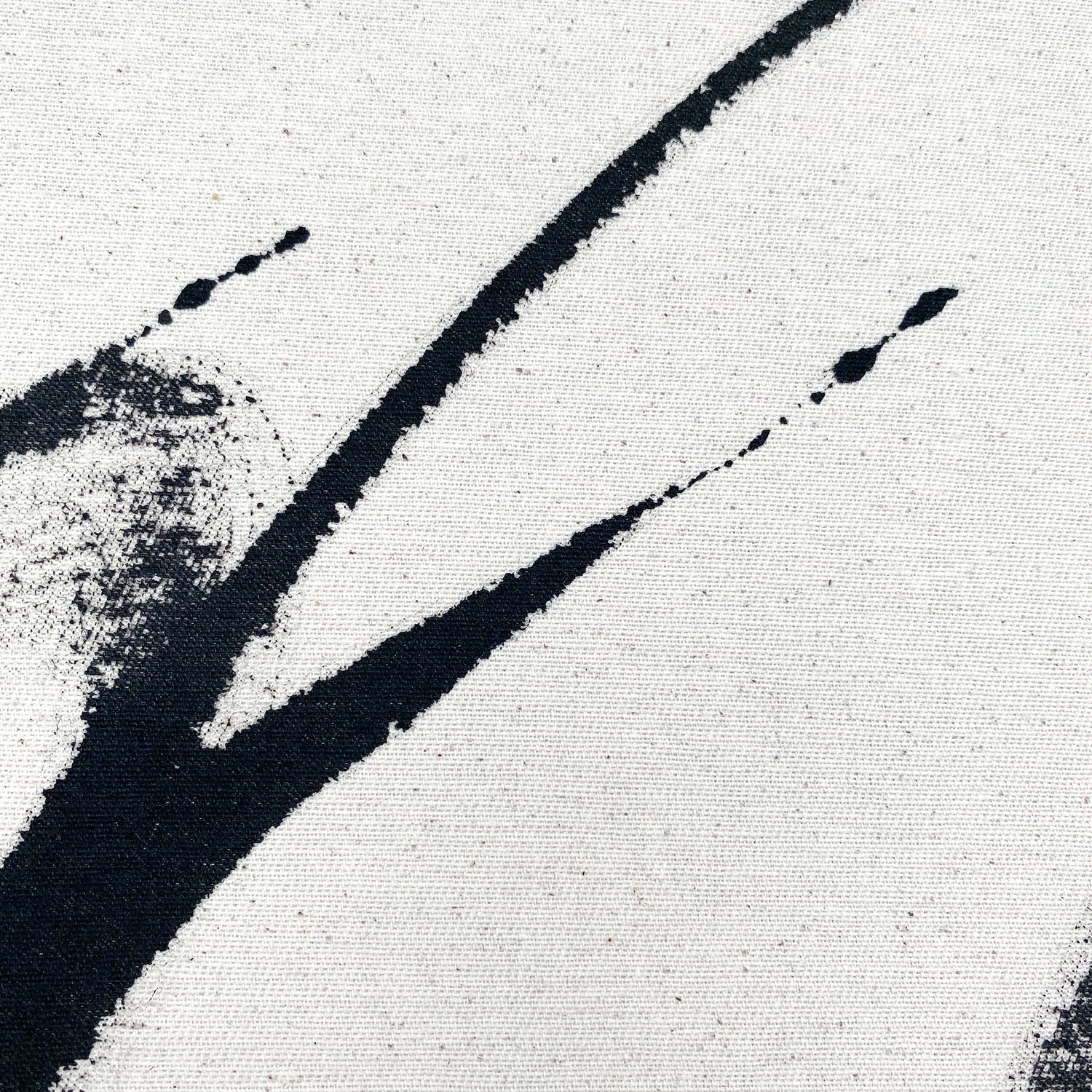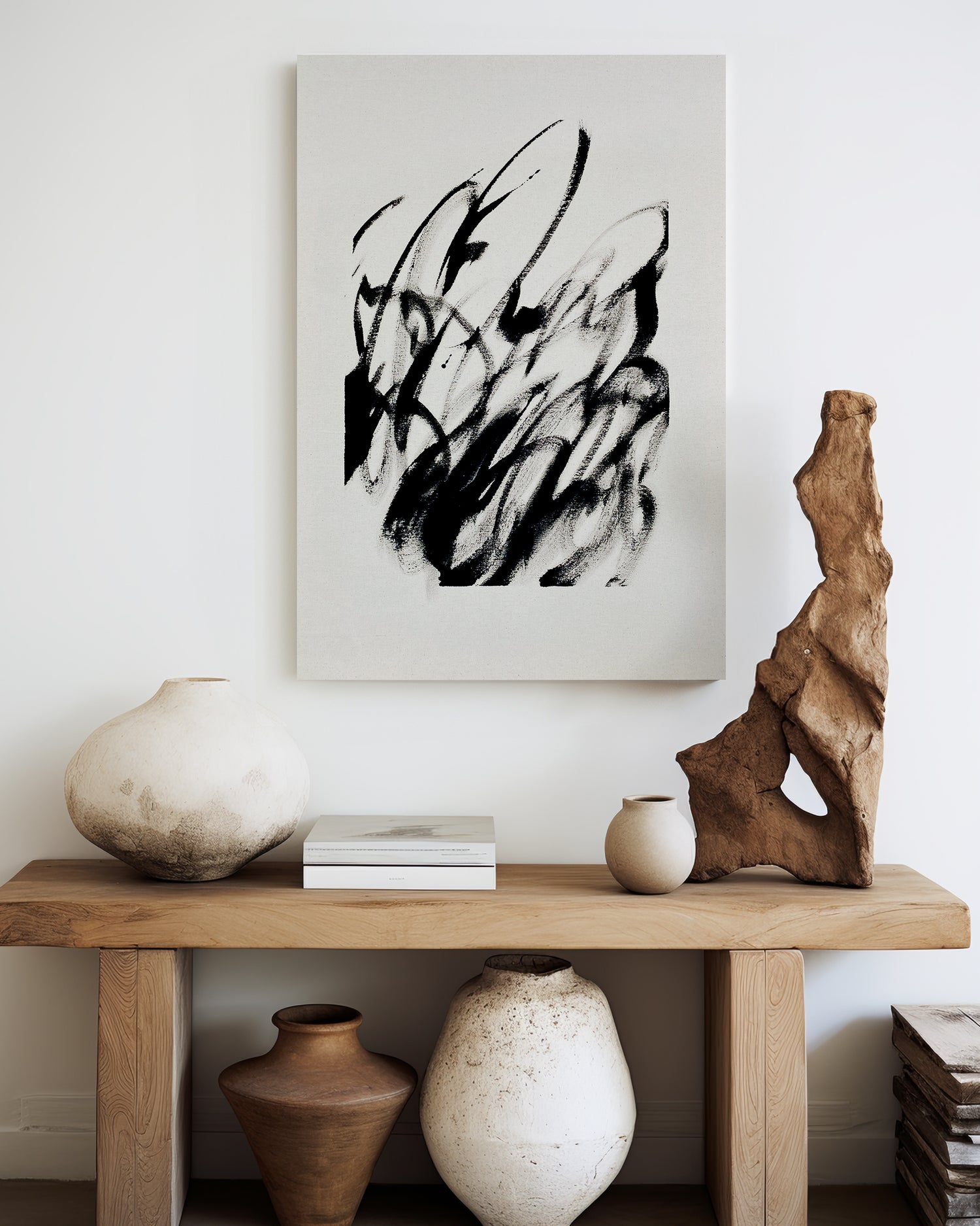 Abstract lines painting. Black paint on warm beige unprimed canvas. Medium format canvas.