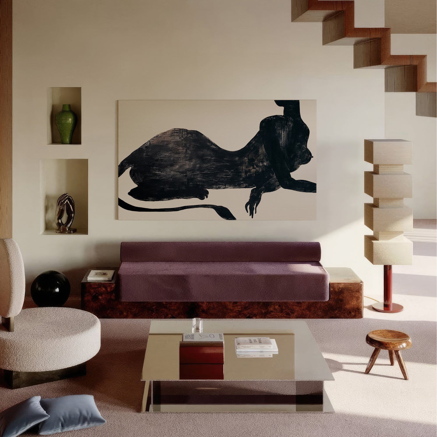 Elegant half-female half-lion body painting. Black on beige background. Large oversized canvas.